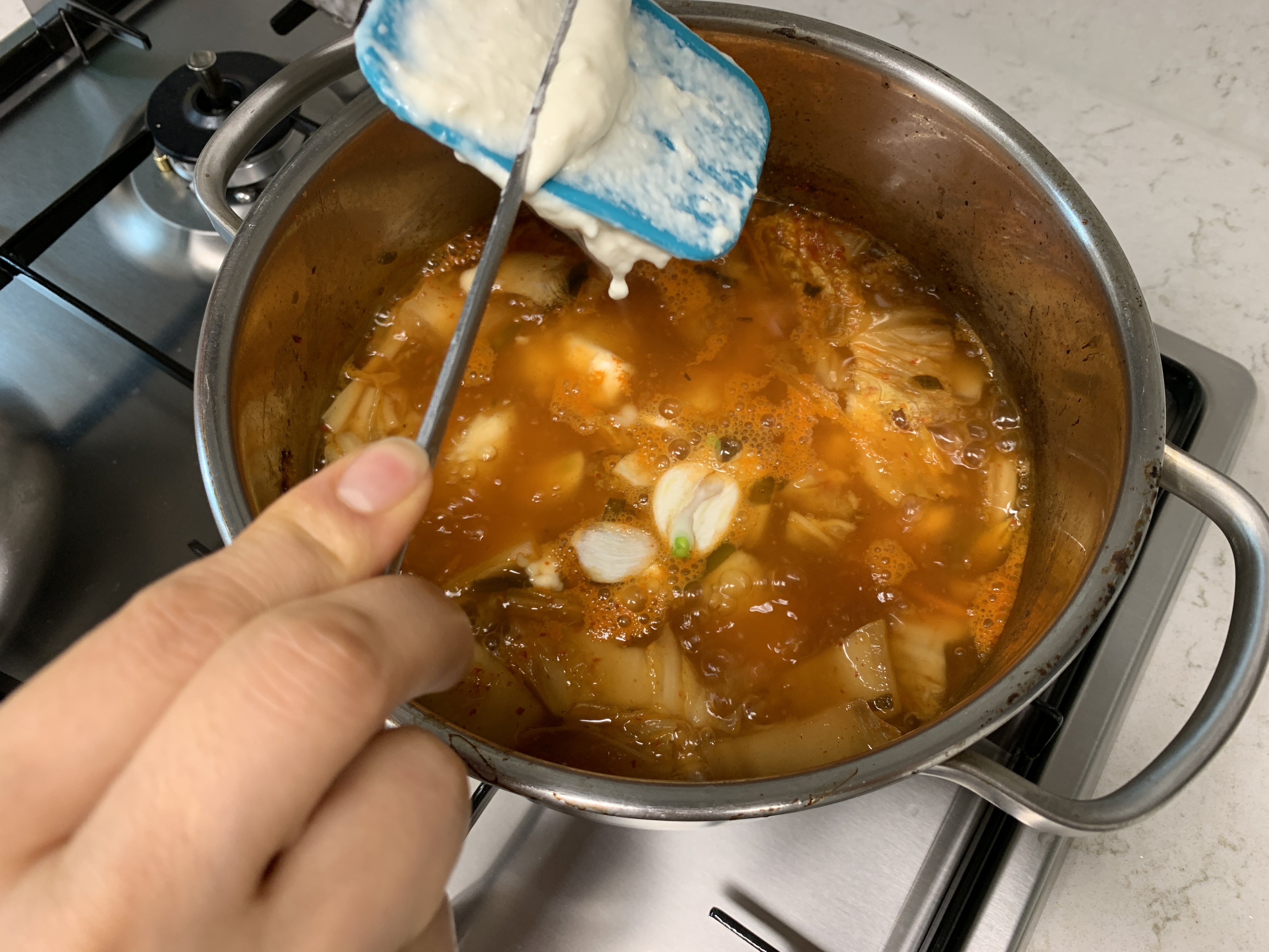 이제 보글보글 끓어 오르는 김치 국물에 반죽해둔 수제비를 넣어줄게요.